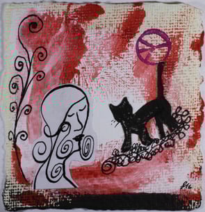 Jedes Bild erzählt eine kleine Geschichte, meistens im Zusammenspiel von einer Katze, sie sind mit hilf von Feder, Pinsel und Stempel erschaffen.